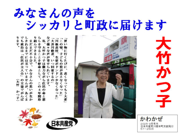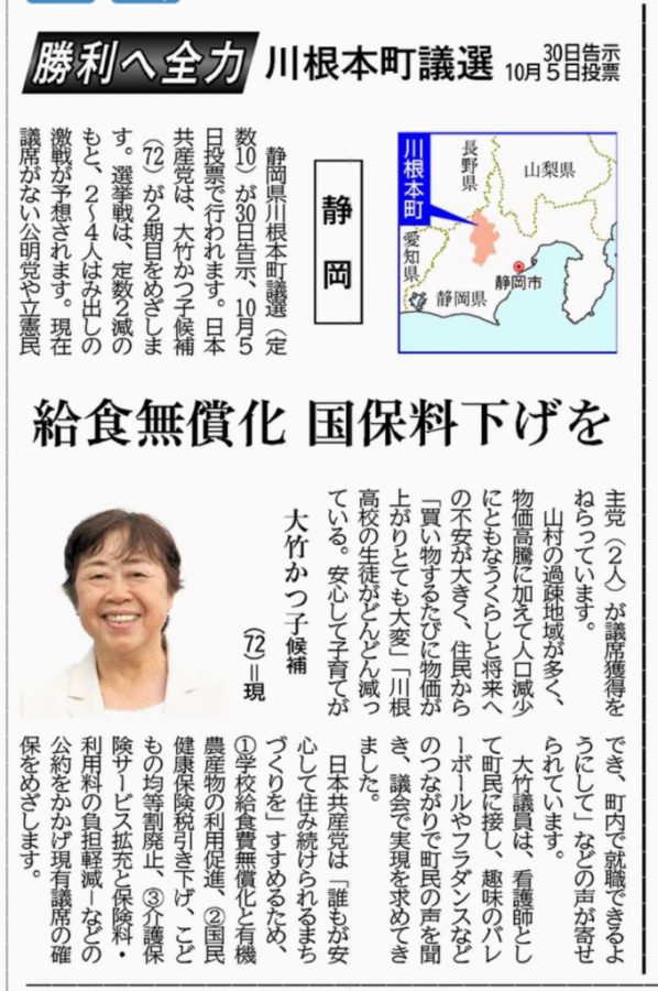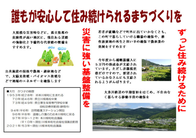 10月5日投開票の川根本町町議選は、大竹かつ子さんは次点で落選となりました。